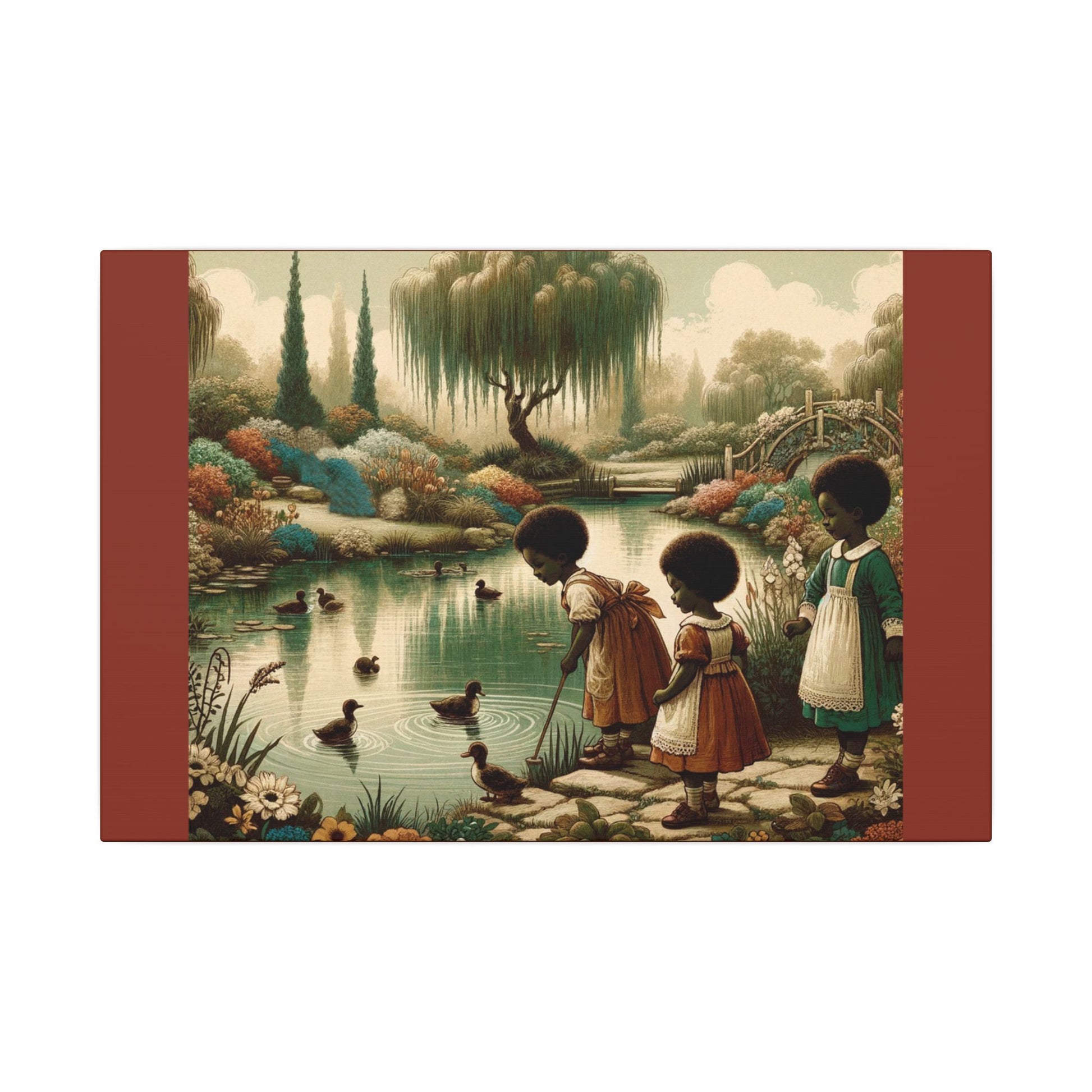 Enfants à l'étang - Toile tendue mate couleur terre d'ombre brûlée