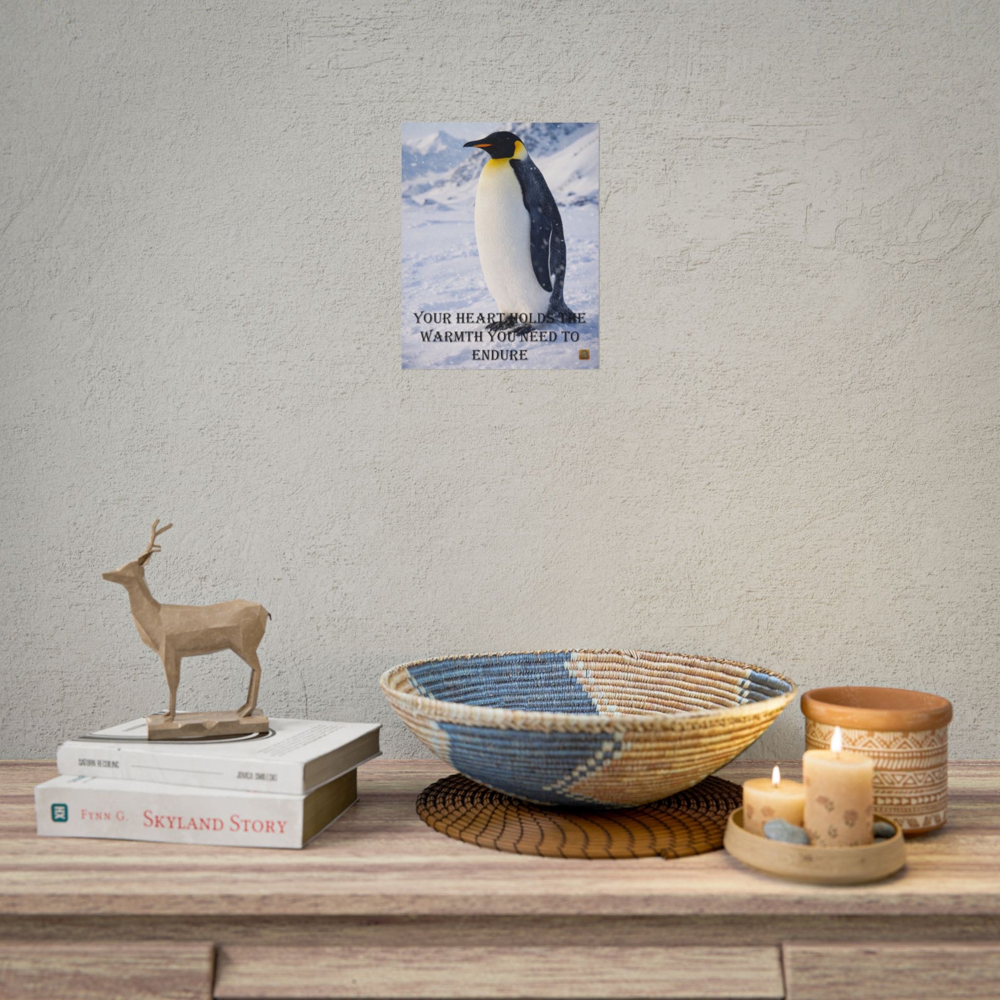 A poster art print that brings quiet resilience and gentle humor to any wall. This poster features a lone emperor penguin standing against a snowy landscape, overlaid with the comforting line: “Your heart holds the warmth you need to endure.” The image is printed with archival-quality inks on matte paper so colors stay vivid and textures read true from soft snowy whites to deep, inky blacks. Choose from multiple vertical sizes to suit a gallery wall, a cozy nook, or a minimalist workspace. Each print arrives rolled for safe shipping and easy framing, ready to become a daily reminder of steady warmth and quiet strength.