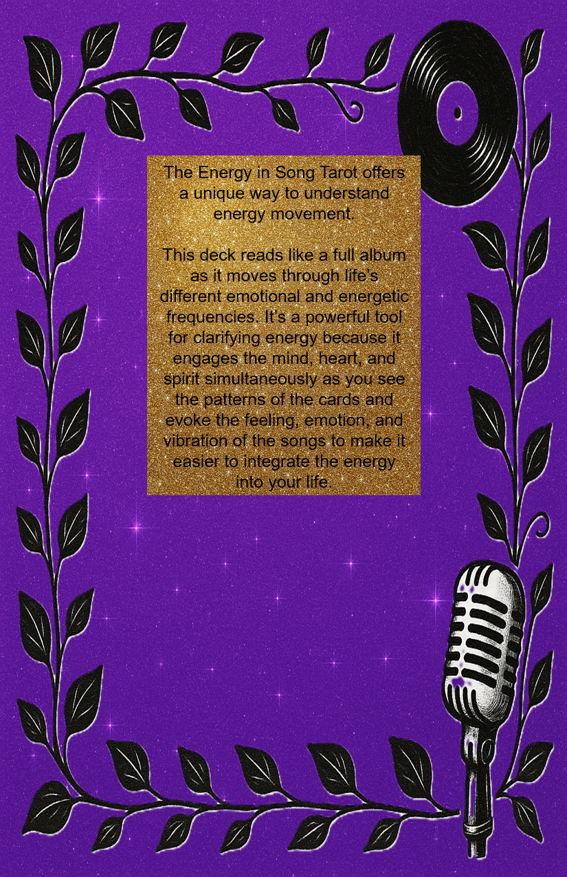 The Energy in Song Tarot Guidebook and deck offers a unique way to understand energy movement. The Major Arcana becomes a playlist of life’s biggest themes like spiritual awakening, love, loss, growth, and purpose. The Minor Arcana suits become genres and moods representing everyday experiences.